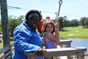 As she gears up for the zip line, Tiger Lilly is visibly nervous. “It’s just like a big slide,” Wykeshia Jones, a Camp Sea Gull staff member, says as she steps up to the top, “This line can hold an elephant!”