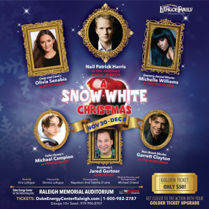 Michael Campion of Netflix's Fuller House and Local Raleigh Area Kids join this star-filled cast! Campion joins previously announced Olivia Sanabia (Disney Channel’s Coop & Cami Ask the World, Amazon’s original series Just Add Magic) as Snow White, Grammy Award-winning recording artist and actress Michelle Williams as The Wicked Queen, Jared Gertner (Broadway’s The Book of Mormon) as Muddles, Garrett Clayton (Teen Beach Movie, Teen Beach 2, Hairspray Live!) as The Huntsman, and Tony Award Winner Neil Patrick Harris as The On-Screen Magic Mirror.