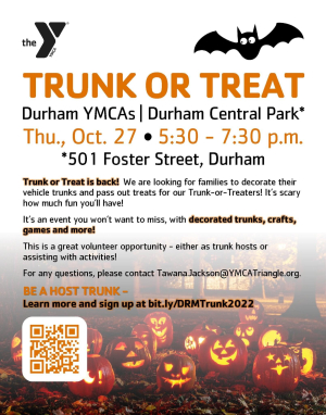 Durham Families – Trunk or Treat is back in Downtown Durham! The Durham YMCA will be hosting Trunk or Treat this year on Thursday, October 27 from 5:30 p.m. -7:30 p.m. at Durham Central Park (501 Foster St, Durham, NC 27701).